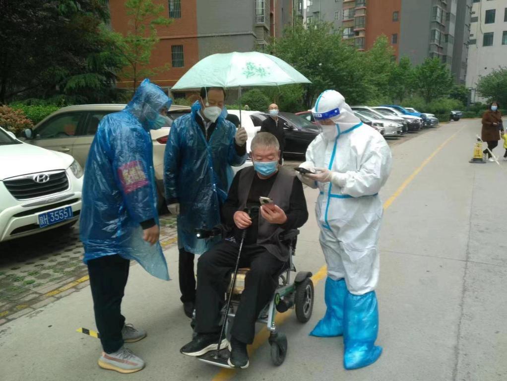 “您好,请把一码通提前找出来。”“请您检测体温。”……区纪委副书记王永红在自己的点位忙前忙后。4月12日九时许,天阴沉沉的,下着小雨,一位老人自己坐着轮椅来到核酸检测点,“同志,这个码怎么弄?”王永红书记立即上前。经询问,老人80多岁,既找不出健康码,也没有拿手机。王永红书记拿着老人的身份证,在信息台为老人申请好健康码,考虑到老人的身体,还提前让老人做了核酸检测。结束后,他把老人送上了电梯。“你们做得太细致了,感谢你们!”临别时,这名老人向王永红和医护人员伸出了大拇指。